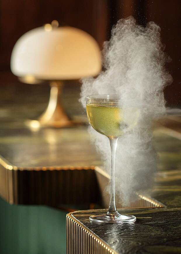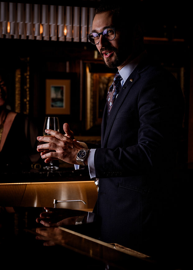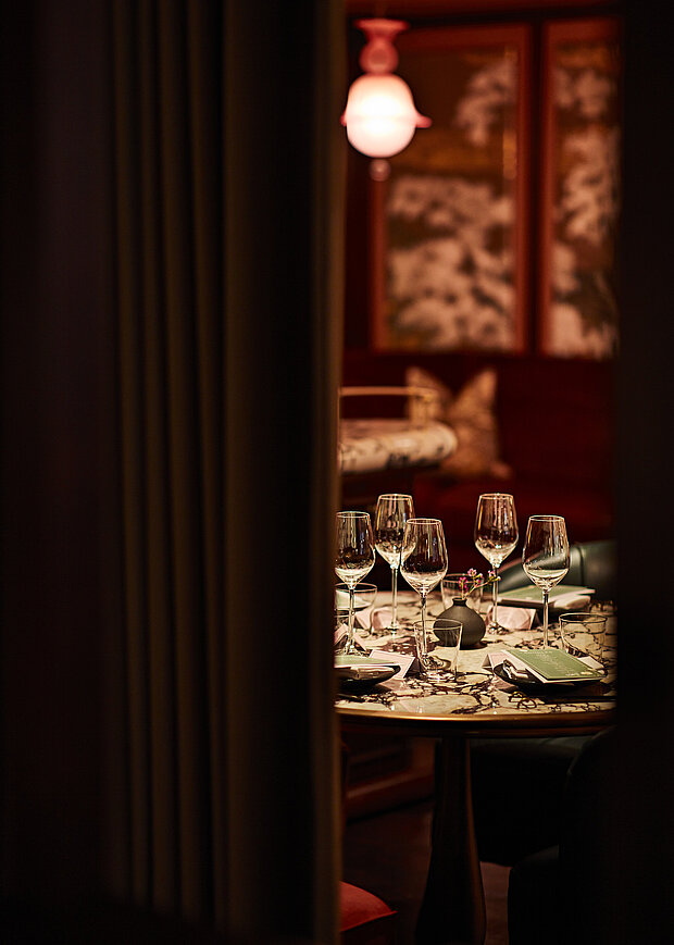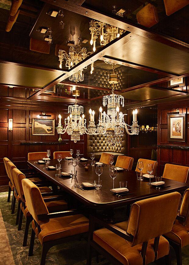 Hidden away from prying eyes, and with a secret private entrance, the Private Dining Room features wood panelling and low ceilings adorned by two crystal-dripping chandeliers and an elegant table with seating for up to 16 guests. In the Private Omakase Bar, the mixologist takes centre stage to entertain up to 10 seated guests.